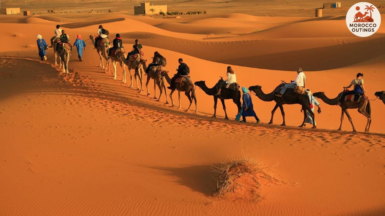 Following the sunrise, travelers prepare for a camel trek across the dunes, guided by experienced local Berber camel handlers. Safety is emphasized as participants are shown proper mounting and riding techniques, and camel saddles are adjusted to ensure comfort during the trek. The journey follows a winding route through the golden sands, ascending small dunes and descending gentle slopes, offering varying perspectives of the desert. Along the way, guides point out camel tracks, desert vegetation, and distant silhouettes of nomadic tents. The rhythmic sway of the camel provides a unique sense of connection to traditional desert travel, echoing the centuries-old routes used by trans-Saharan caravans. Travelers are encouraged to pause at select high points to admire sweeping vistas and capture memorable photographs, fully immersing themselves in the desert’s quiet majesty.