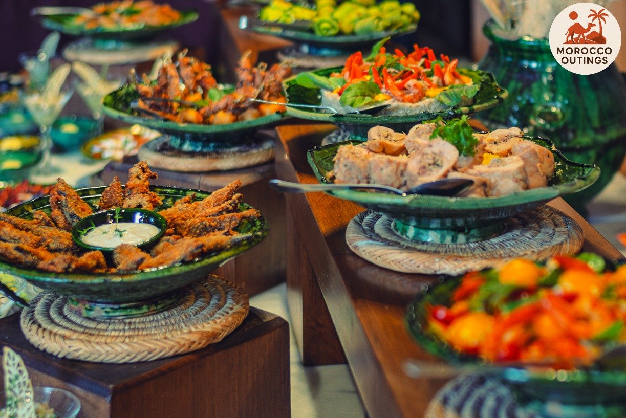 Traditional Moroccan meals including lunch, dinner, and tea
