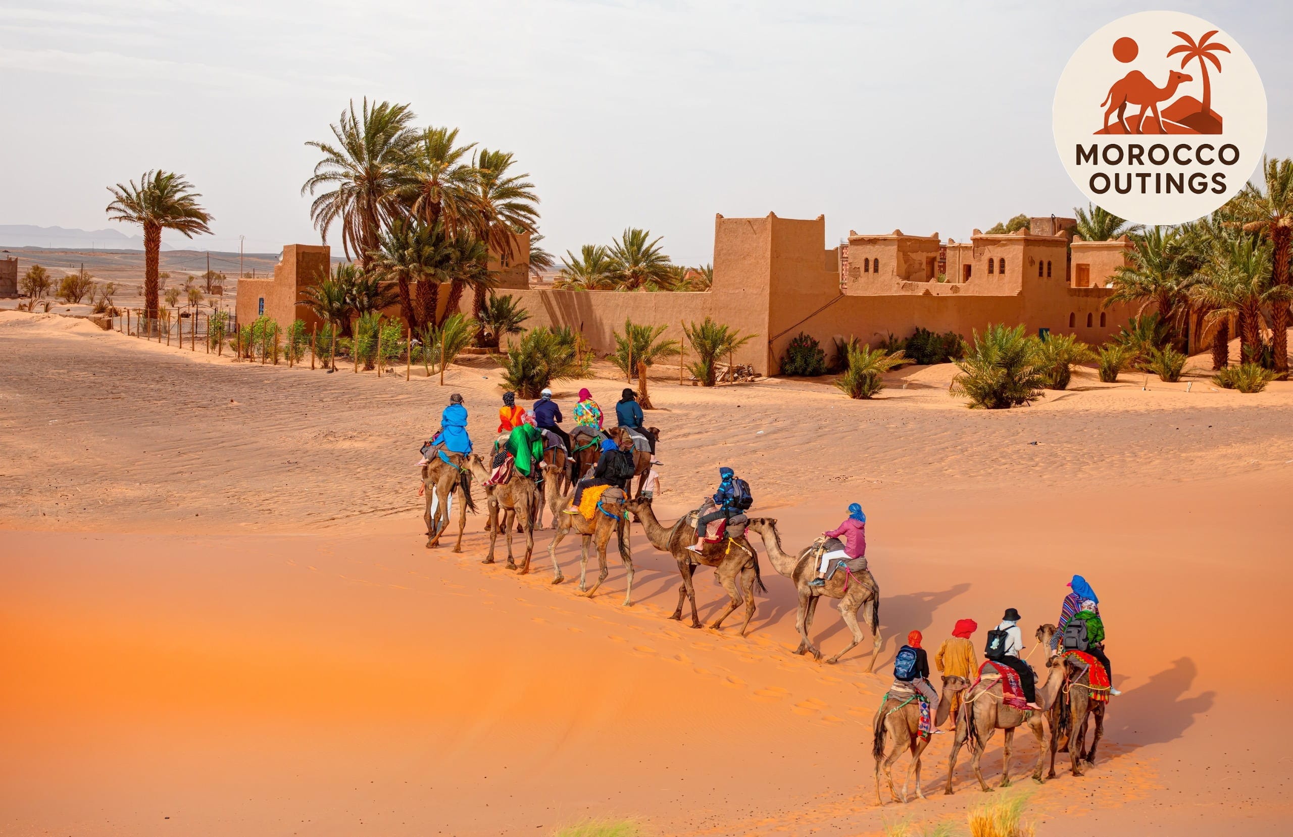 | Day 2 | Fes → Midelt → Ziz Valley → Merzouga | Drive through Middle Atlas mountains via Ifrane & Imouzzer. Visit cedar forests with Barbary monkeys, lunch in Midelt, then pass Ziz Valley and Berber villages. Arrive at Merzouga for a sunset camel ride and overnight in a desert camp. |