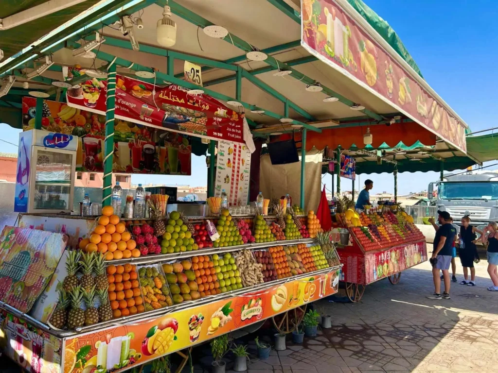 After breakfast, you’ll depart Fes for Marrakech by your preferred mode. The train is smooth and scenic (~6.5–7.5 hours with assigned seats), while a private road transfer covers ~530 km in 6.5–8 hours depending on stops. We’ll arrange door-to-door service either way, with packed snacks and lounge access in stations on request. On arrival mid-to-late afternoon, your host will orient you near Jemaa el-Fnaa—acrobats, storytellers, orange juice stands, and the call to prayer rolling across rooftops. You will drift into the souks as lanterns glow, tasting fresh-squeezed juice and honeyed chebakia. You will climb to a terrace at golden hour to watch the square transform as food stalls fire up and music gathers. If time allows, we’ll preview the Koutoubia gardens or a quick hop into the kasbah quarter. Expect minimal in-city transfers tonight (10–15 minutes by foot or short taxi). Turn in to your riad with Marrakech whispering just outside.
