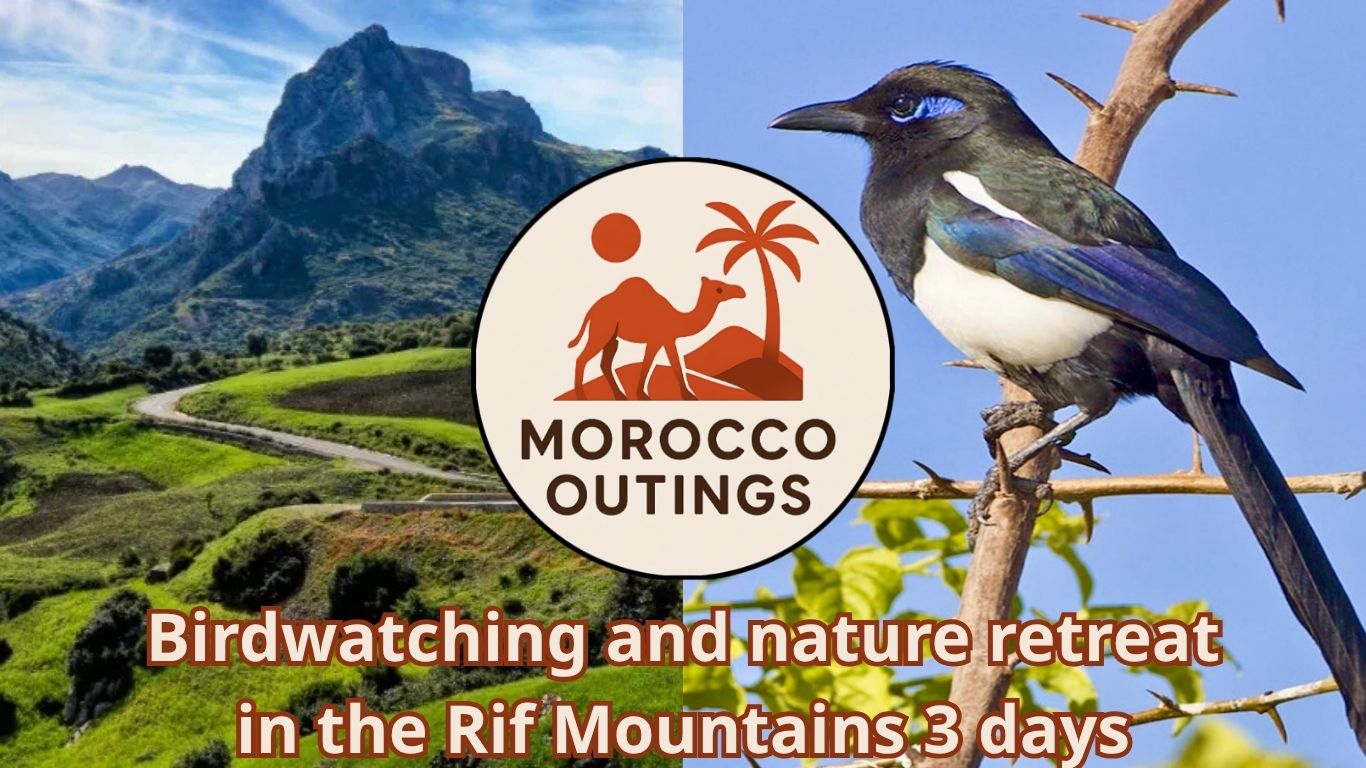 Birdwatching and nature retreat in the Rif Mountains 3 days is a serene escape designed for travelers seeking harmony with nature, fresh mountain air, and unforgettable encounters with Morocco’s rich wildlife. Nestled in the northern landscapes of Morocco, the Rif Mountains offer a peaceful sanctuary far from the rush of city life, where rolling hills, lush cedar forests, and hidden valleys create the ideal habitat for a wide variety of bird species, including migratory raptors, woodland songbirds, and rare highland wildlife. This journey is more than just a birdwatching experience—it is a full nature retreat, blending gentle trekking, forest walks, panoramic photography stops, and moments of mindful relaxation in eco-friendly lodges surrounded by untouched landscapes.